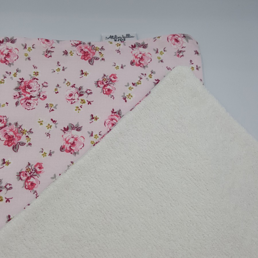 Χειροποίητο πετσετάκι θηλασμού διπλής όψης κατασκευασμένο από 100% βαμβακερά υφάσματα ελεγμένα και πιστοποιημένα για βλαβερές ουσίες σύμφωνα με το Oeko-Tex Class 1. Η μια όψη αποτελείτε βαμβακερό floral ύφασμα και η άλλη πλευρά είναι από ύφασμα πετσέτας, εξαιρετικά απορροφητικό και πολύ μαλακό, ιδανικό για το δερματάκι του μωρού σας