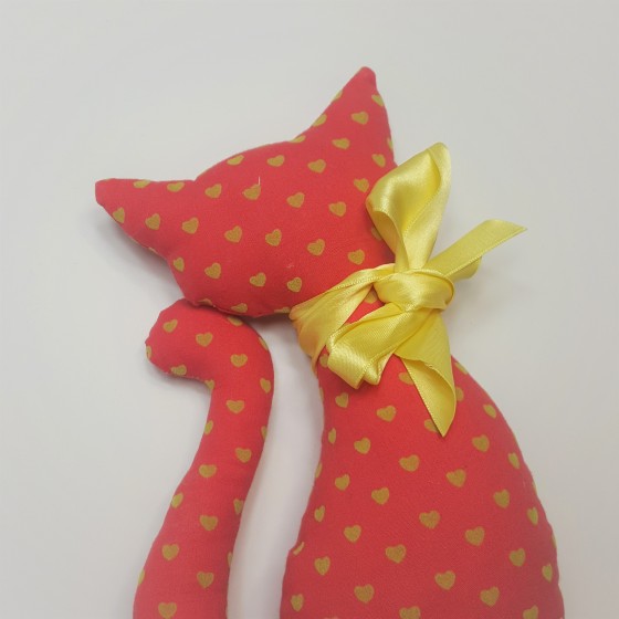 Υφασμάτινο παιχνίδι γατούλα σε κόκκινο ύφασμα με καρδούλες.