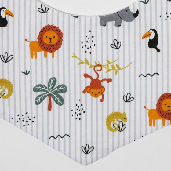 Σαλιάρα με ζωάκια της ζούγκλα, ριγέ, κατασκευασμένη από 100% βαμβακερό ύφασμα και μαλακό πικέ εσωτερικά, πιστοποιημένα σύμφωνα με το Oeko-Tex Class 1. Συνδυάζοντας με τον καλύτερο τρόπο στυλ και άνεση.